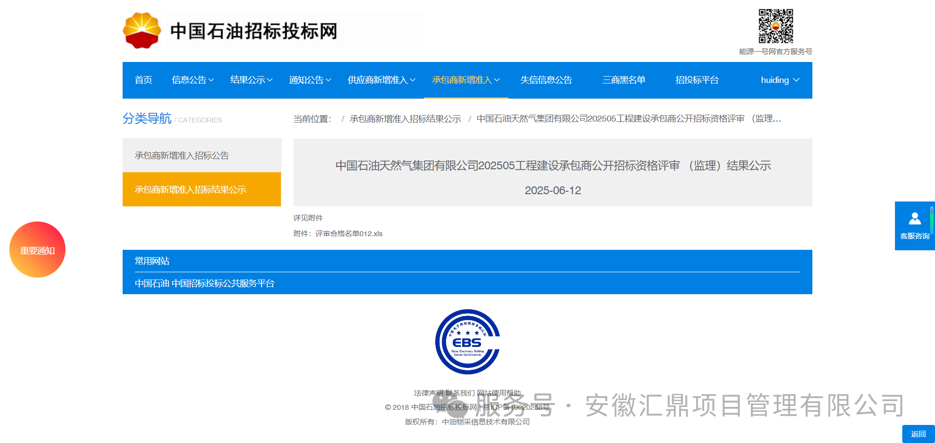 汇鼎公司入围中国石油天然气集团有限公司202505工程建设承包商公开招标资格评审(监理)名单