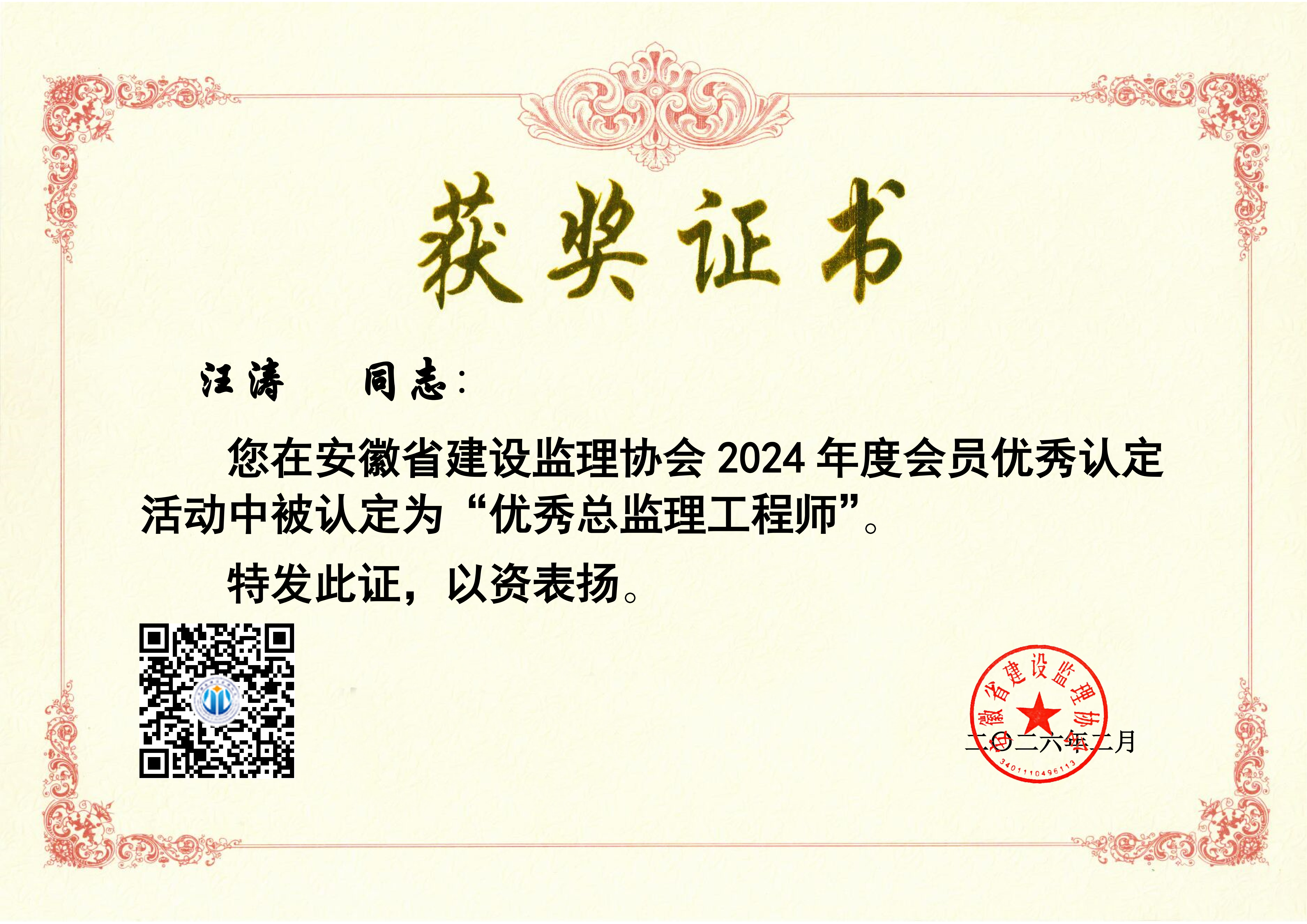汪涛获2022年度安徽省优秀监理工程师